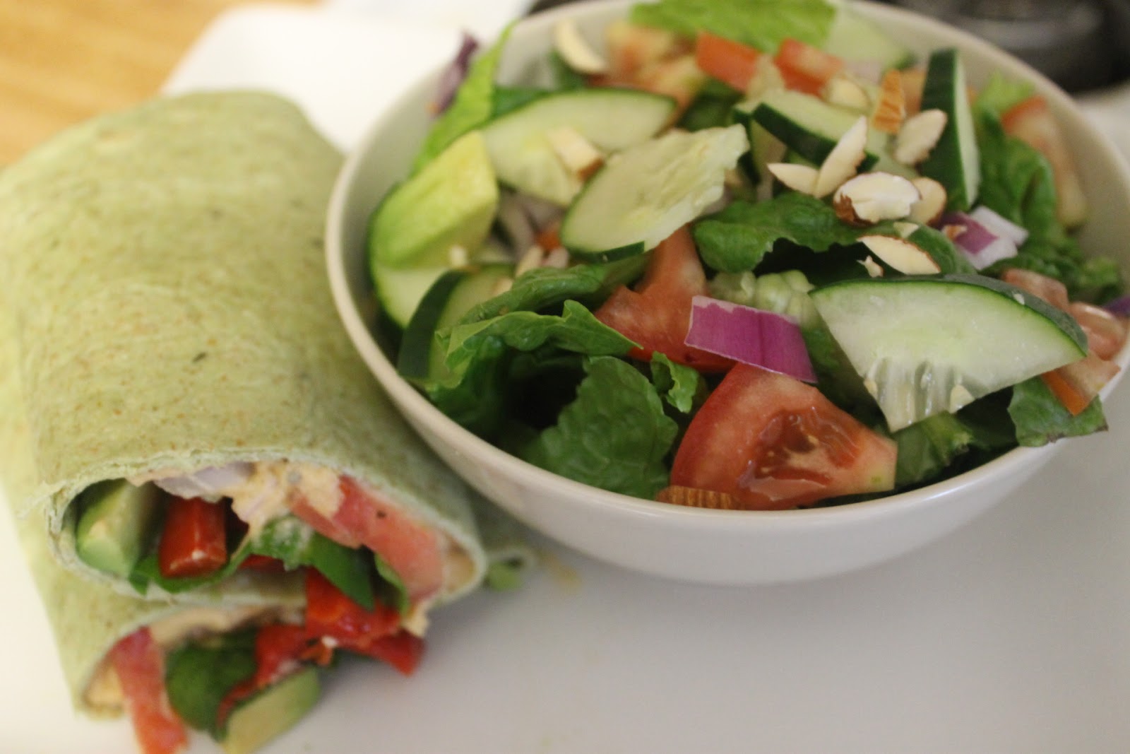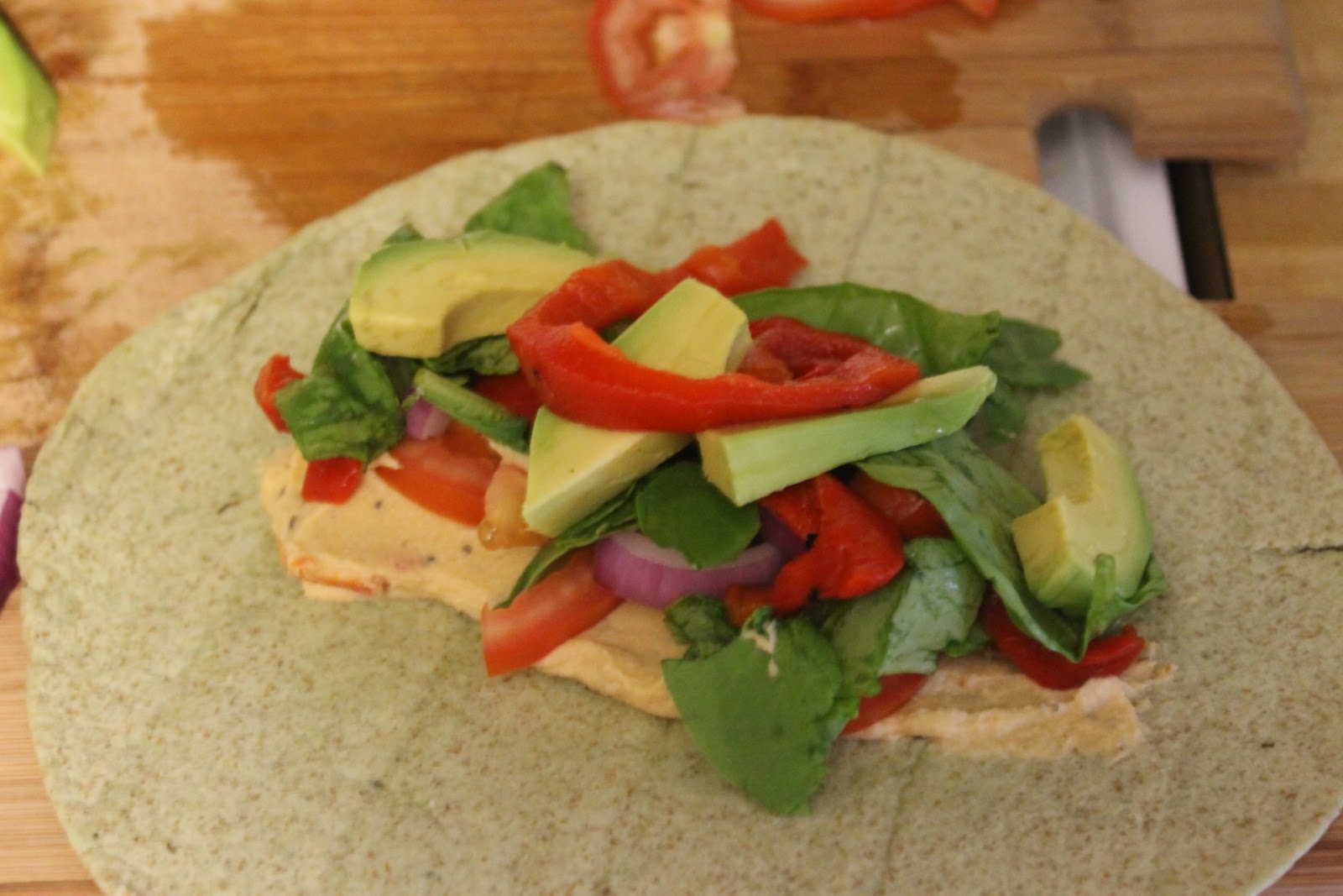 - Wrap (there are all kinds: spinach, roasted tomato, plain, etc. The top pic, I show a wrap with lightly sauteed kale, red peppers, onion, tomato, hummus)