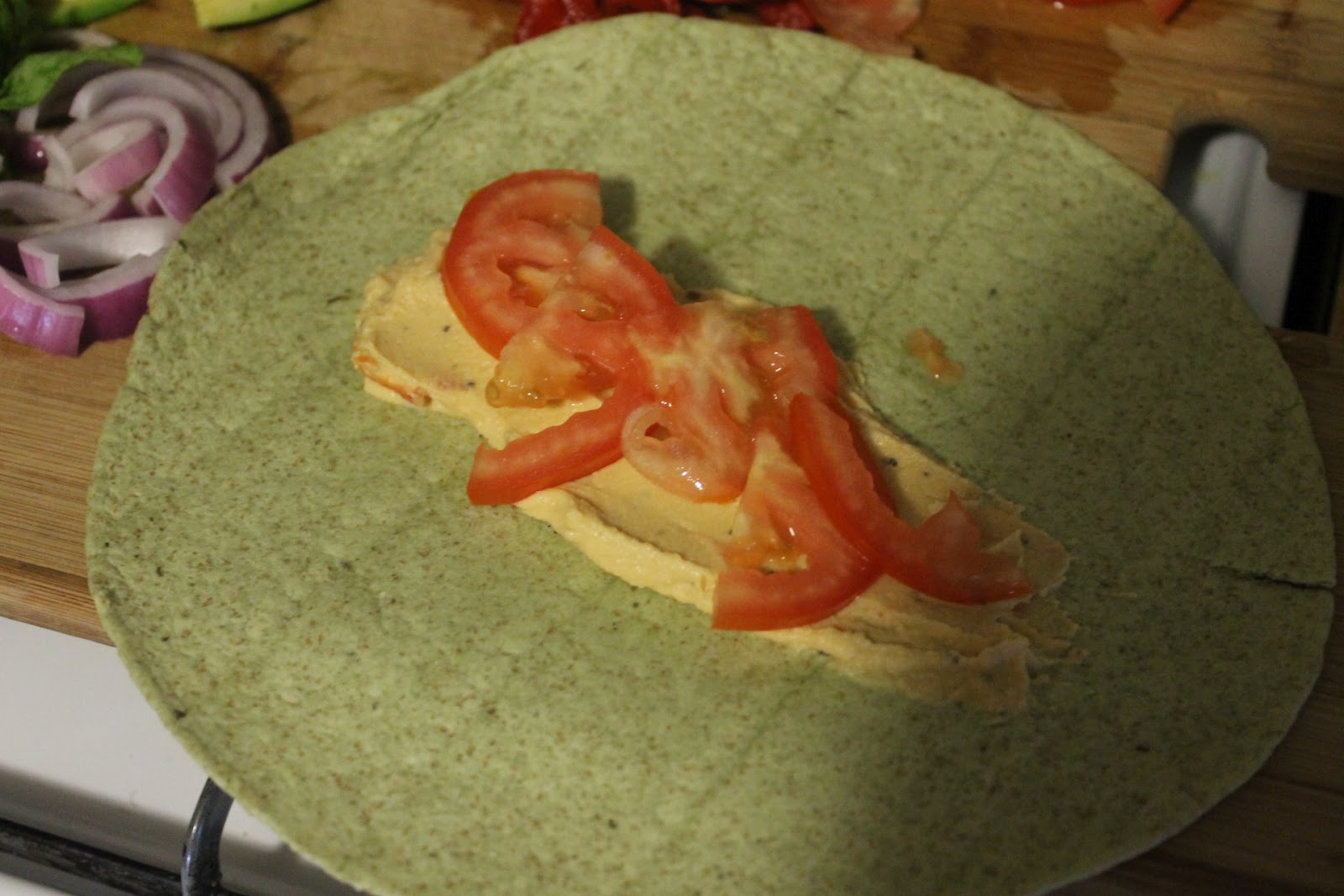 It's actually pretty simple, just pile your ingredients, beginning with your hummus, in the center of your wrap. Once ingredients are packed in the center, wrap your wrap (no pun intended), cut in half and serve with a fresh green leaf side salad or just enjoy solo!!